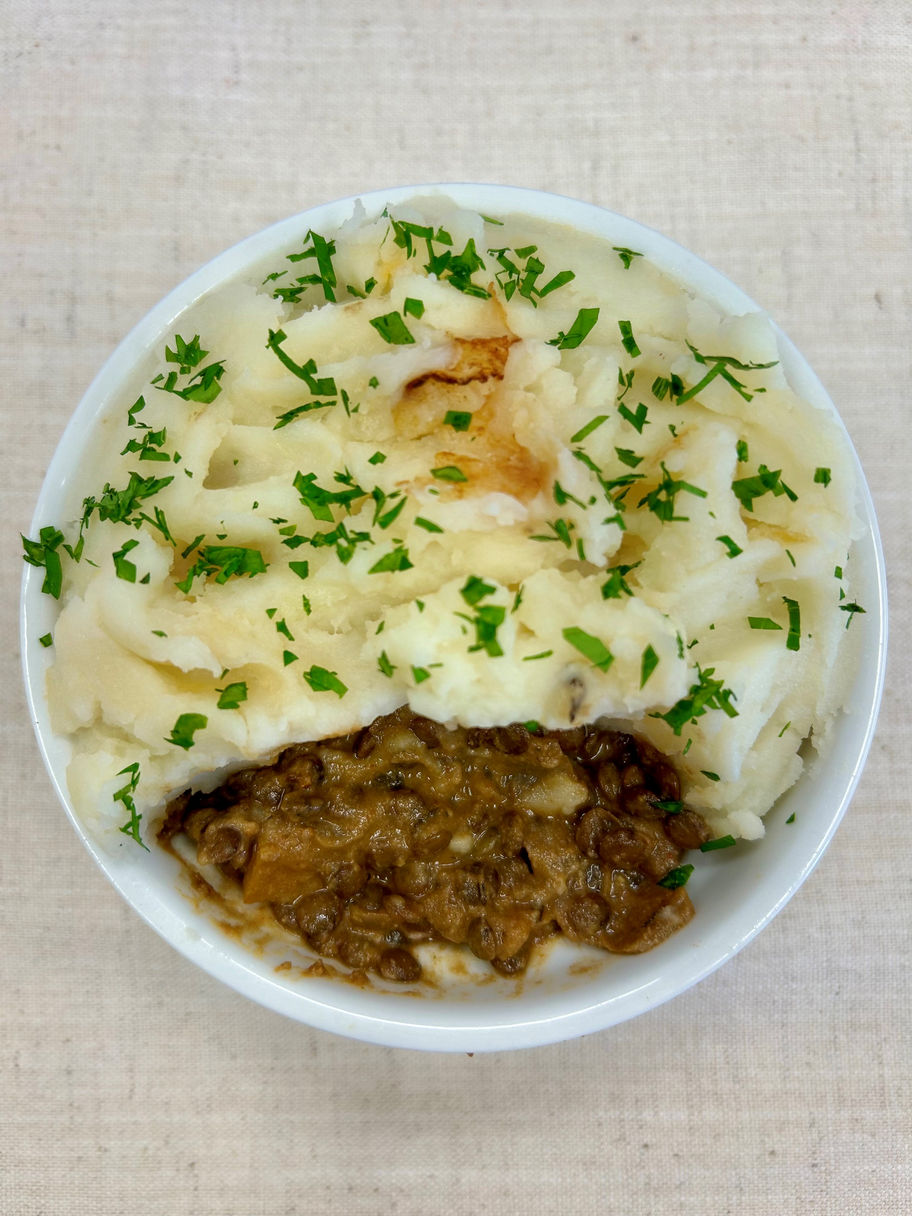 A wholesome, flavorful twist on the classic dish; green lentils, mushrooms, carrots & peas in a rich gravy, topped with a creamy layer of red skinned mashed potatoes. Served with a side of mushroom gravy.
