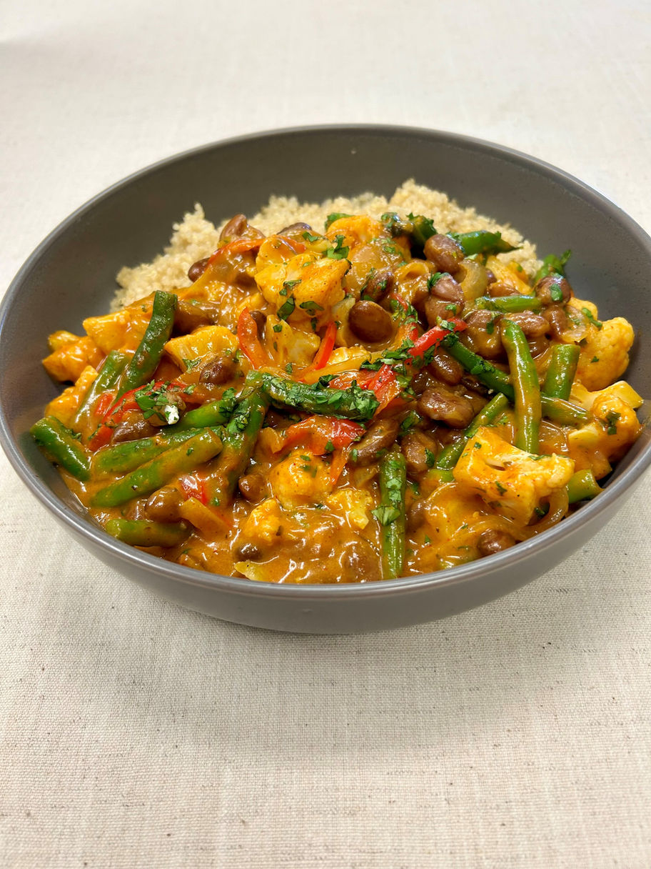 Sweet potatoes, cauliflower, green beans & black beans in a Thai-style sauce. Served with brown basmati rice.